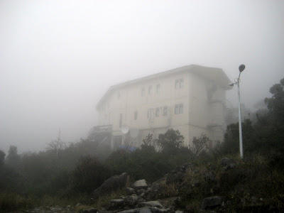 我是团里第一个先抵达的成员,所以帮组员拿了5和8号的房间钥匙。房间在二楼,勉强拖着笨重的脚步来到房门前,脱了鞋子和袜子,放下背包,整个人虚脱地呆立在房间里。接下来才意识到该打通电话回家保平安,并从随身包里拿出已关机的手机。一接通,才和妈妈说了一句我到了半山之类的话,眼泪抑制不住地拼命地掉,声音也哽咽。听到妈妈的赞扬时,情绪更是一发不可收拾,哭到我妈招架不住,赶紧换人叫我妹妹来听。好不容易制止了眼泪,打给静怡报告时也发生同样的事情。当时迷迷糊糊地牢骚了一大堆,现在我已想不起来了。冷静下来回想从早上8.45到下午4.30,我已走了约7个小时又45分的艰难山路。一个人头一次登到这么高,难免还是会对未知的前路感到害怕,虽然遇到艰辛的时刻都坚强的面对了,到底心里多少存有余悸。因此成功到半山时,统统累积的不安感全爆发了。